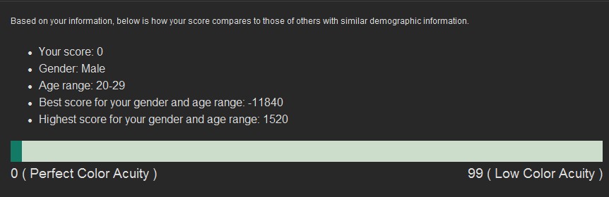 估计眼睛就因为这么玩命看小说搞得。。。然后我又好死不死去做那个色彩测试。。结果竟然是全对orz上次在家眼睛没事的时候做还错了三个,这次眼睛疼得快睁不开了反而全对。。。是我家显示器有问题还是说眼睛越疼注意力越集中吗(’;°;ё;°;)